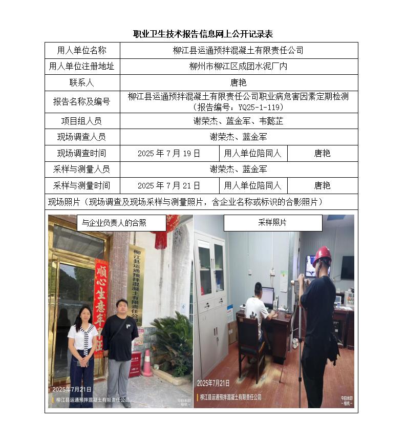 柳江縣運通預(yù)拌混凝土有限責(zé)任公司職業(yè)病危害因素定期檢測