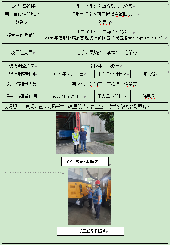 柳工(柳州)壓縮機有限公司 2025年度職業(yè)病危害現(xiàn)狀評價報告