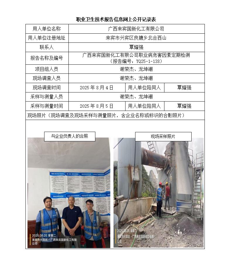 廣西來賓國(guó)新化工有限公司職業(yè)病危害因素定期檢測(cè) (報(bào)告編號(hào):YQ25-1-138)